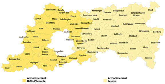![]() EPC-BRABANT is voornamelijk actief in de regio Vlaams-Brabant (meer bepaald in het arrondissement Halle-Vilvoorde, het donkergele gedeelte op de kaart). Toch kunnen wij op verzoek ook buiten deze regio werken. Aarzel dus niet ons te contacteren voor een opdracht elders.